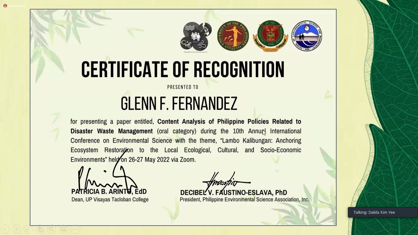 10th Annual International Conference on Environmental Science, May 26-27, 2022, University of the Philippines Visayas Tacloban College